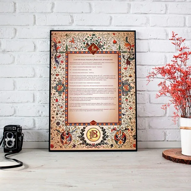 По желанию заказчика мы можем оформить семантическое описание на специальном художественном бланке, распечатать в формате А3, оформить под стекло и в багет. Также мы предоставляем отдельную услугу «геральдическая графика». Это для истинных ценителей красоты и эстетики! МЫ СОЗДАЕМ ВЫСОКОХУДОЖЕСТВЕННЫЕ ГРАФИЧЕСКИЕ ПРОИЗВЕДЕНИЯ. В отдельно разработанные и выполненные профессиональным художником грамоты/бланки/сертификаты вносим оформленное особым каллиграфическим шрифтом семантическое описание. В результате получается настоящий предмет роскоши, который будет равноценным дополнением к Вашему символу.