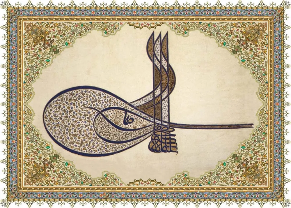 Тугра по сути и герб, и монограмма. В этом знаке есть свои составляющие, внешний и внутренний овал, флагштоки, кинжал, локоны и основание. Основные обозначения это символы власти, территориальное преимущество и имя правящего султана.