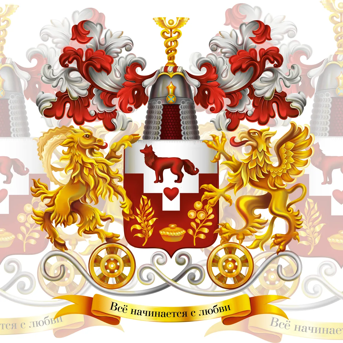 В данном гербе собраны символы, каждый олицетворяющий одного из членов семьи! Элементы расположены таким образом, что символы, относящиеся к женской половине семьи, находятся внутри щита, а символы, олицетворяющие мужское начало, держат щит, являются защитниками и опорой. А клейнод и подножие имеют отношение к профессиональной деятельности и предпочтениям армигера. Также интересным фактом является то, что герб выполнен строго в трех цветах: золото, серебро и червлень – самые благородные цвета в геральдике.