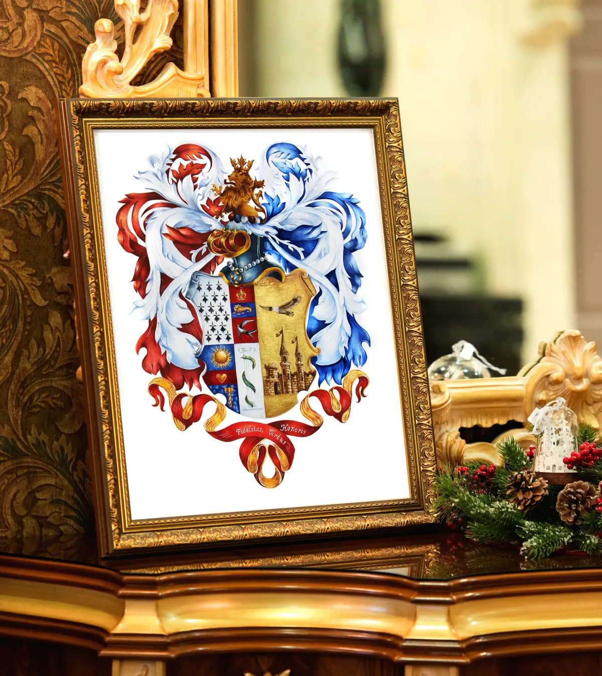 Этот фамильный герб, выполненный в технике тонкой акварели, — не просто художественная работа. Это личная история семьи, рассказанная через цвет, символы и благородные линии. Подарок, который несёт в себе глубину чувств и уважение к человеку, ради которого он был создан. Каждый элемент герба раскрывает характер рода: мудрость и стойкость, честь и стремление к свету, ценность традиций и силу внутренней опоры. Красные, синие и золотые оттенки переплетаются в композиции, создавая ощущение достоинства, благородства и наследия, которое живёт сквозь поколения.